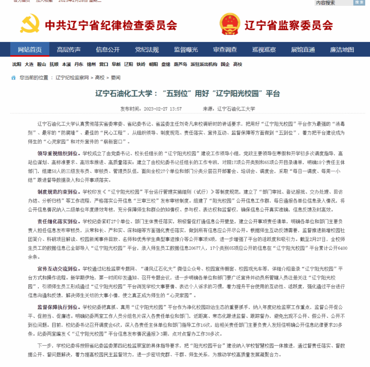 编者按:近日,辽宁纪检监察网对我校认真贯彻落实省委常委、省纪委书记、省监委主任刘奇凡来校调研时的讲话要求,把用好“辽宁阳光校园”平台作为最强的“消毒剂”、最牢的“防腐墙”、最佳的“民心工程”,从组织领导、制度规范、责任落实、宣传互动、监督保障等方面做到“五到位”,着力把平台建设成为师生的“心灵家园”和对外宣传的“崭新窗口”进行了宣传报道。现将相关报道转载如下: