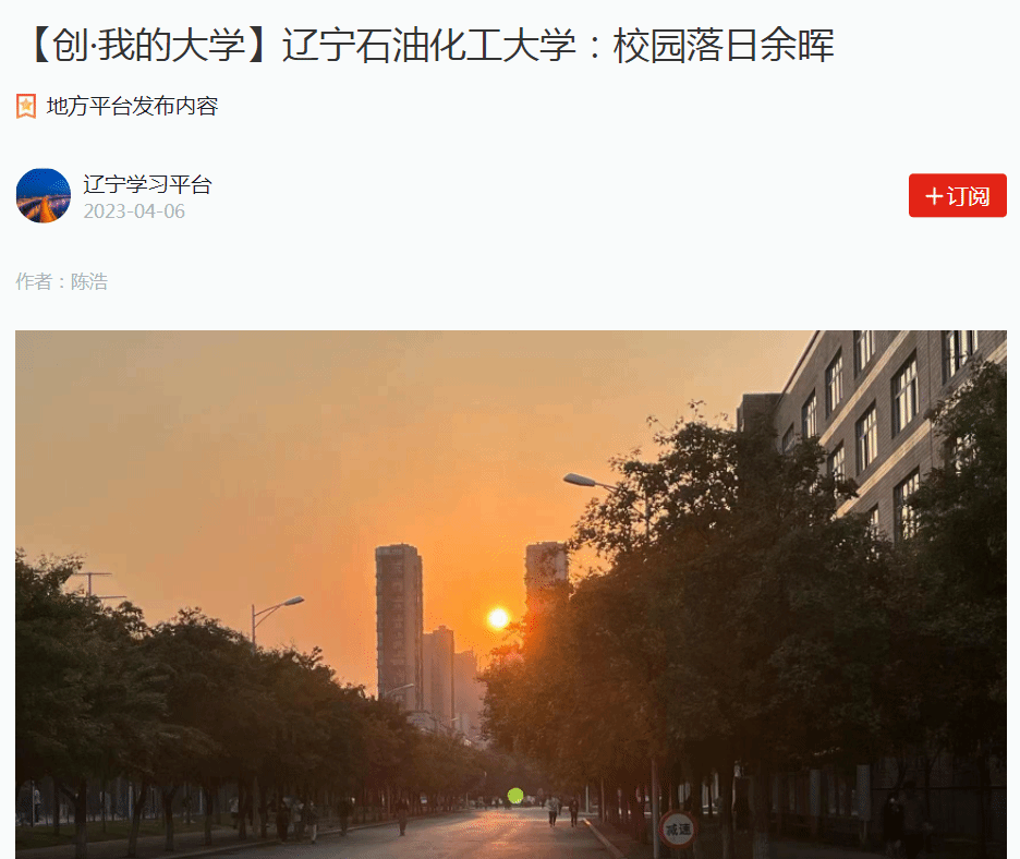 编者按:近日,学习强国辽宁学习平台对我校宣传部选送的新媒体工作室陈浩同学拍摄的校园美景落日余晖图集进行了宣传报道。现将相关报道转载如下: