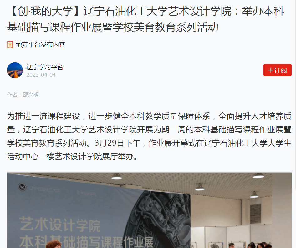 编者按:近日,学习强国辽宁学习平台、人民日报客户端·人民号、辽宁日报·北国号等媒体平台对我校艺术设计学院为推进一流课程建设,进一步健全本科教学质量保障体系,全面提升人才培养质量,开展为期一周的本科基础描写课程作业展暨学校美育教育系列活动进行了宣传报道。现将相关报道转载如下: