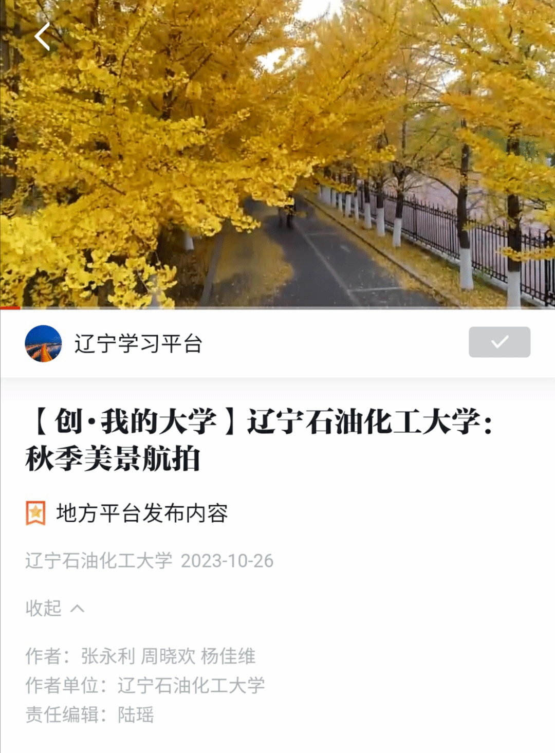 编者按:近日,学习强国辽宁学习平台、人民日报客户端·人民号等媒体平台对我校校园秋季美景航拍进行了宣传报道。现将相关报道转载如下: