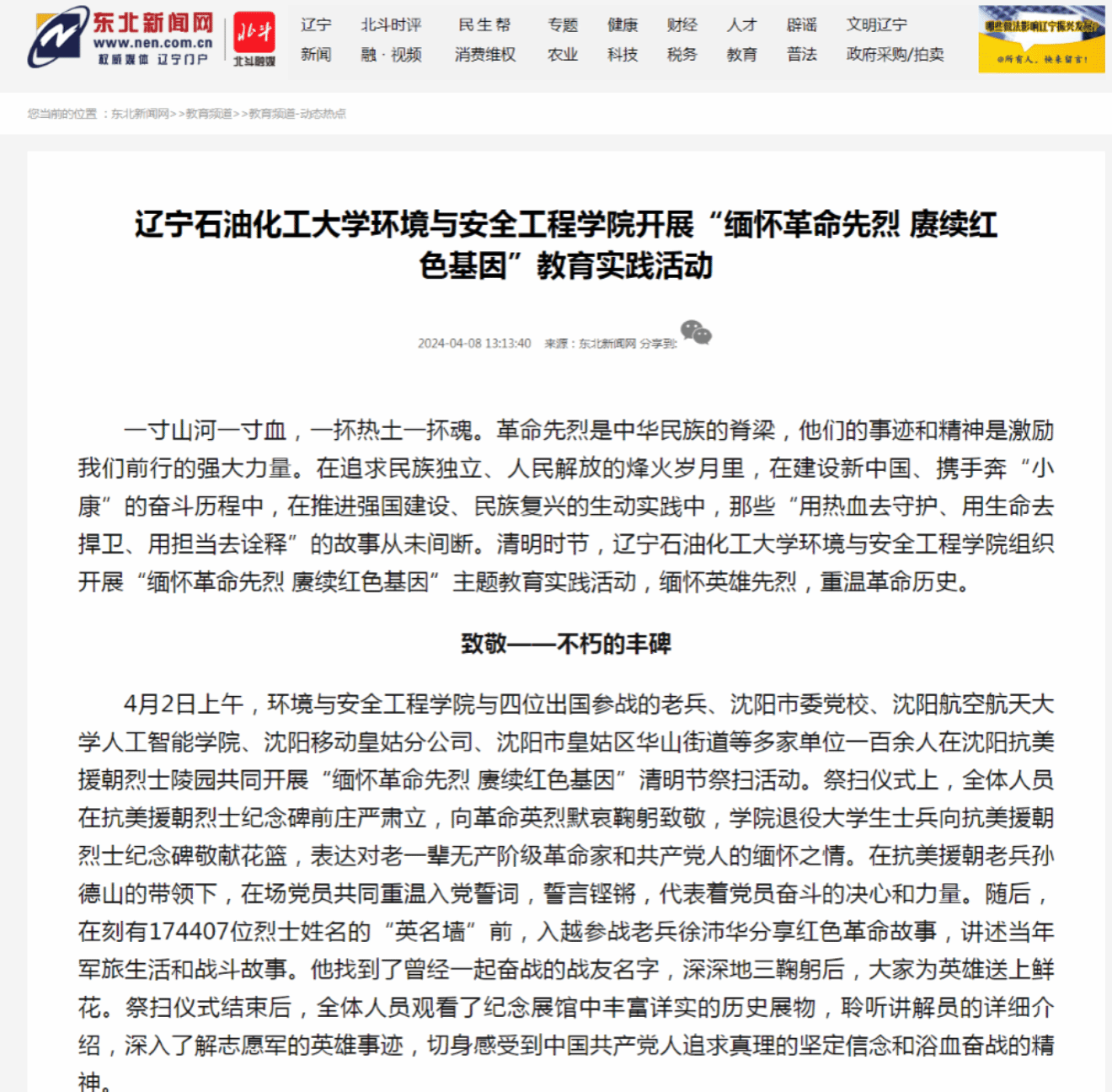 编者按:近日,东北新闻网对我校环境与安全工程学院组织开展的“缅怀革命先烈 赓续红色基因”教育实践活动进行报道,现将相关报道转载如下: