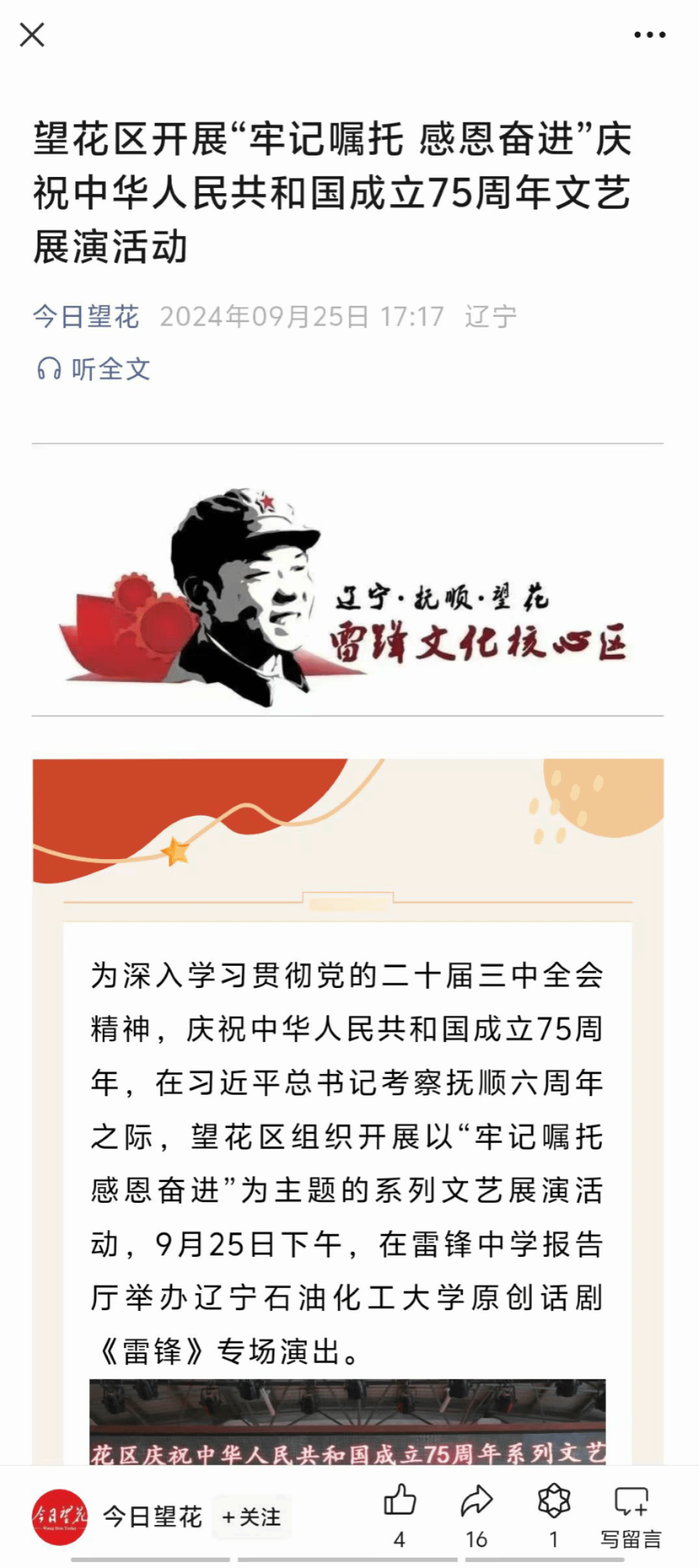 编者按:近日,抚顺市望花区组织开展以“牢记嘱托 感恩奋进”为主题的系列文艺展演活动,活动中,我校原创话剧《雷锋》在雷锋中学报告厅举行专场演出。现将相关报道转载如下: