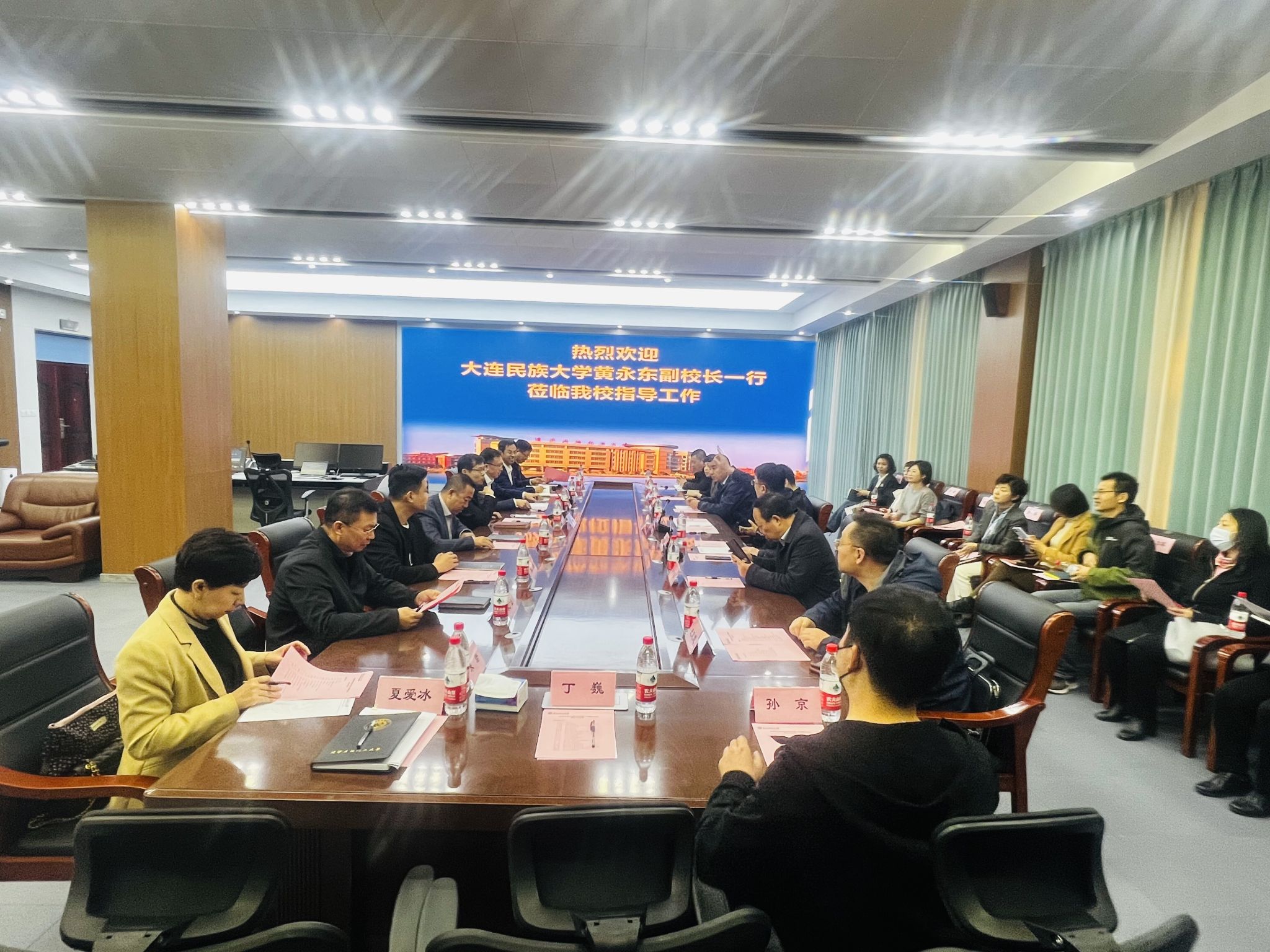 4月14日上午,大连民族大学黄永东副校长一行19人到我校进行新一轮本科教育教学审核评估调研交流。交流座谈会在大学生创新创业活动中心四楼会议室举行。副校长曹江涛参加会议,会议由教务处处长李会鹏主持。